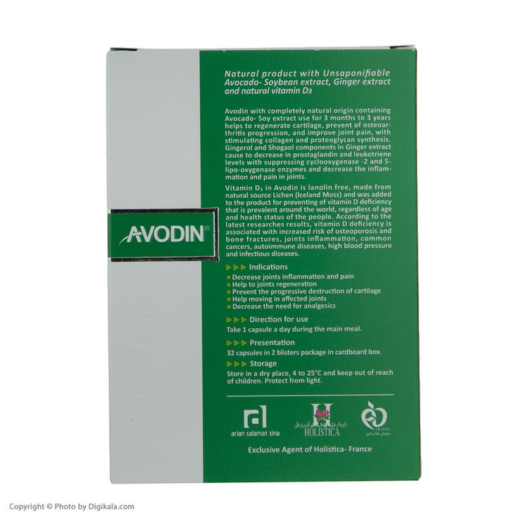 کپسول آوودین هولیستیکا بسته 32 عددی کپسول آوودین هولیستیکا بسته 32 عددی (avodin capsule) یک مکمل تحت لیسانس فرانسه است که با داشتن ترکیبات موثر طبیعی و گیاهی مانند سویا و آووکادو در کنار ویتامینها، میتواند به کاهش دردهای مفصلی و غضروفسازی کمک کند. قرص اودین مدت زیادی است که به فروش میرسد و در دسته بندی مکملهای مخصوص مفاصل، همواره بسیار محبوب بوده است. در ادامه بیشتر در مورد خواص این محصول صحبت میکنیم. ویژگیهای کپسول آوودین کپسول آوودین هولیستیکا بسته 32 عددی در بخشهای مختلف مربوط به مفاصل و استخوانها موثر است و با داشتن ترکیباتی که هر یک فواید متفاوتی دارد، میتواند مجموعهای از خواص را به دنبال داشته باشد: • کاهش دردهای مفصلی • درمان آرتروز و کاهش علایم • درمان گرفتگی مفاصل و کمک به تحرک بدون درد • کاهش التهاب مفاصل و کمک به غضروف سازی • کند کردن روند ساییدگی غضروف و مفاصل ترکیبات موثر کپسول آوودین در فرمولاسیون داروي avodin از ترکیبات گیاهی و ویتامین استفاده شده که میتوانند غضروف ساز بوده و تاثیر خوبی روی سلامت استخوانها داشته باشند: • عصاره آووکادو سویا: هم آووکادو و هم سویا دارای ویتامینها و ترکیبات ضد التهاب مختلف هستند که سبب میشوند قرص آوودین برای دیسک کمر مناسب باشد و به کاهش دردهای زانو و مفاصل هم کمک میکنند. • زنجبیل: زنجبیل یکی دیگر از مواد طبیعی با خاصیت ضد التهاب است. از زنجبیل در شکلهای مختلف برای تخفیف آرتروز و کاهش میزان درد استفاده میشده است و حضور آن در کپسول هولیستیکا بسته 32 عددی هم به بهبود درد مفاصل کمک میکند. • ویتامین دی: یکی دیگر از مهمترین ترکیبات قرص آوودین است که برای جلوگیری از پوکی استخوان ضروری است. این ترکیب همچنین به جذب کلسیم در بدن کمک میکند