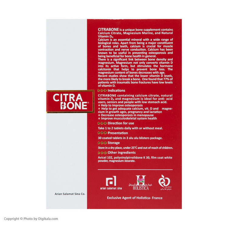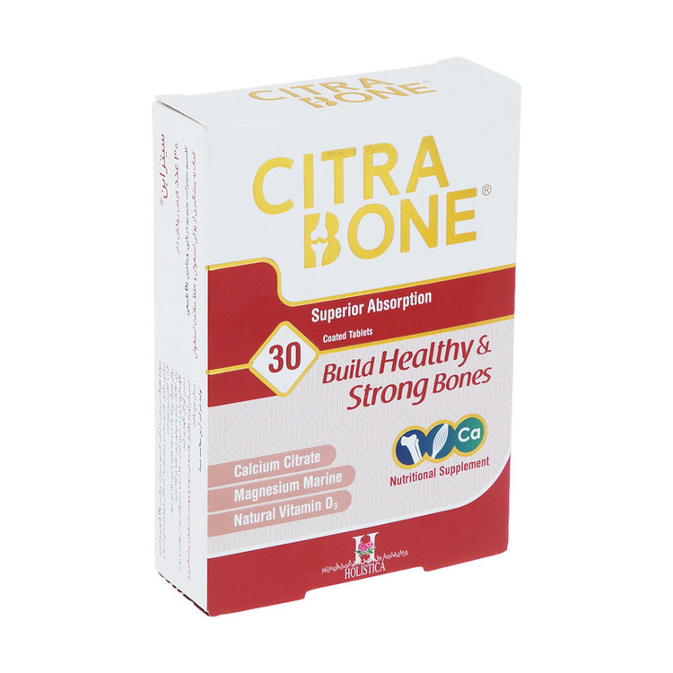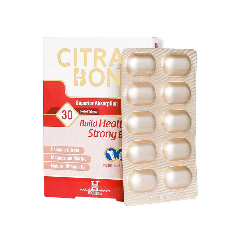 قرص روکش دار سیترابن هولیستیکا مکمل غذایی ویژه، محتوی کلسیم سیترات، منیزیم دریایی و همچنین ویتامین D3 طبیعی است. ترکیب کلسیم سیترات برای افرادی که به علت مشکلات گوارشی و مصرف داروهای آنتی اسید نمی توانند از سایر ترکیبات کلسیم استفاده کنند بسیار ایده آل است.