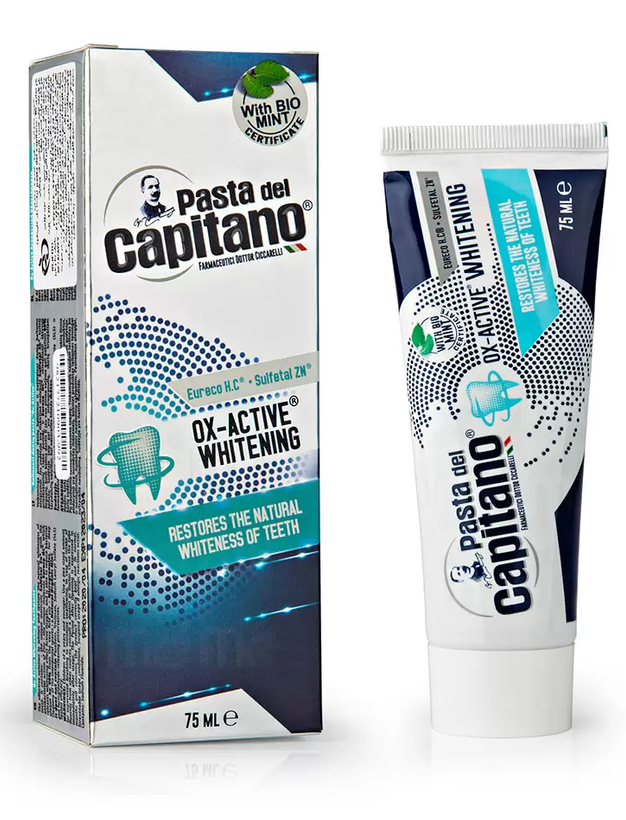 شرکت ایتالیایی پاستا دل کاپیتانو (Pasta Del Capitano) همواره خمیردندانهای با کیفیتی را طراحی و تولید میکند. در بین خمیردندانهای تولید شده توسط این شرکت، خمیردندان سفید کننده پاستا دل کاپیتانو مدل OX-active، مولکول (EurecoTMHC) غنی شده که این مولکول با آزاد کردن اکسیژن فعال خاصیت سفیدکنندگی داشته و از شکلگیری 99 درصد از پلاکهای دندانی جلوگیری میکند.
