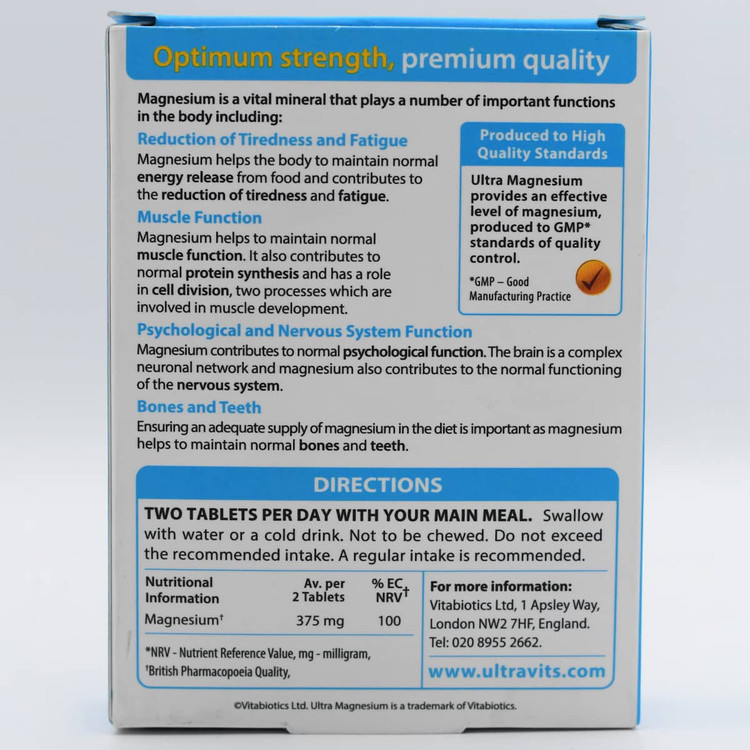 اولترا منیزیم مکمل غذایی حاوی 375 میلیگرم منیزیم به ازای 2 عدد قرص است که به جبران کمبود منیزیم، عملکرد طبیعی عضلات، حفظ سلامت سیستم عصبی، کاهش اسپاسمهای عضلانی، سلامت و تراکم استخوانها، عملکرد طبیعی سیستم قلبیعروقی، سنتز پروتئین، تولید انرژی، کاهش شدت و تکرار حملات میگرن، بهبود علائم سندرم پیش از قاعدگی، بهبود خلق و خو و افزایش کیفیت خواب کمک میکند. اولترا منیزیم بهشکل قرص در جعبه مقوایی 60 عددی تحت لیسانس شرکت Vitabiotics انگلستان تولید میشود. شرکت ویتا آریا دارنده پروانه ساخت قرص اولترا منیزیم در ایران است.