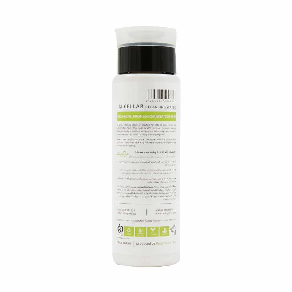 میسلار واتر 3 در 1 پوست چرب و مختلط مارگریت به طور موثر آرایش، سبوم و آلودگیهای پوست را پاک کرده و با تنظیم ترشح چربی، از ایجاد آکنه پیشگیری میکند. فرمولاسیون این محصول فاقد الکل، پارابن و مواد صابونی است و نیازی به آبکشی ندارد. همچنین به کار رفتن ترکیباتی همچون سالیسیلیک اسید و روغن درخت چای باعث خاصیت آنتی اکسیدانی بالای این میسلار واتر شدهاند که به کاهش التهابات پوستی کمک میکند. خوشبختانه در میسلار واتر 3 در 1 مارگریت مناسب پوست چرب هیچ گونه ترکیبات حساسیت زا به کار نرفته است و افراد میتوانند بدون نگرانی از این محلول به صورت روزانه استفاده نمایند.