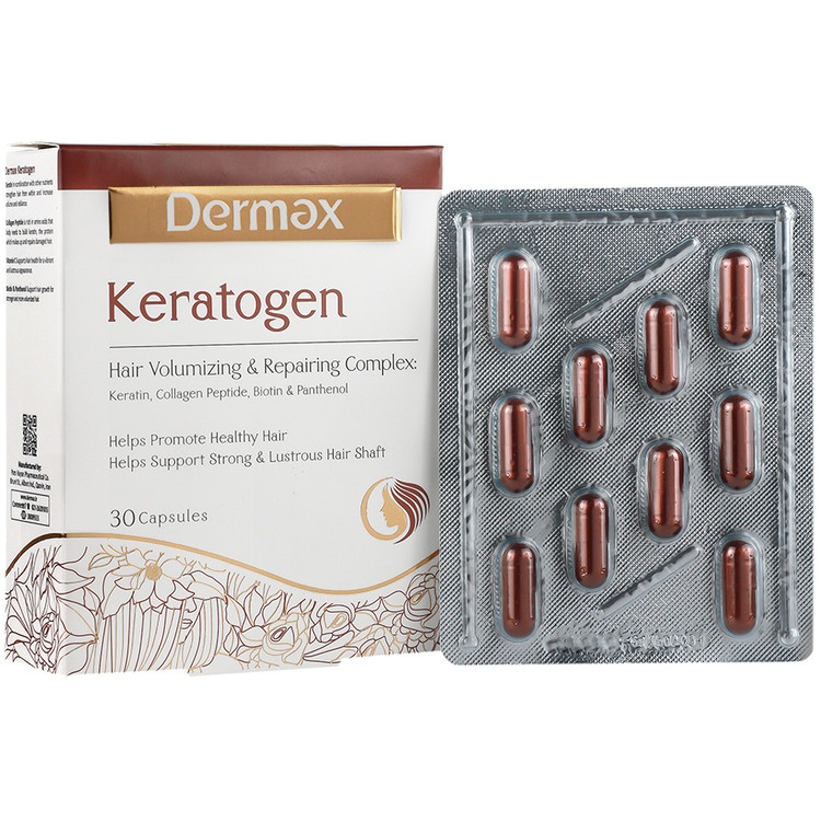 کپسول کراتوژن درمکس یک محصول مراقبت از موی قدرتمند است که با کراتین و کلاژن پپتاید غنی شده و به طور ویژه برای حفظ و تقویت سلامت موهای شما طراحی شده است. این فرمول پیشرفته به تقویت ساقه مو کمک میکند و اطمینان میدهد که موهای شما همچنان قوی، درخشان و پر از زندگی باقی بماند. ناگفته نماند مواد مغذی موجود در درمکس کراتوژن سبب درخشندگی و ضخامت تار مو و همچنین رشد مو میشود. خوشبختانه این فراورده فاقد سویا، شیر، گندم، تخم مرغ، هرگونه شیرین کننده و نگهدارنده است. شما میتوانید با خرید قرص تقویت مو و استفاده از آن، استحکام موهای خود را بالا ببرید و در برابر عوامل محیطی آسیب رسان از موهایتان محافظت کنید.