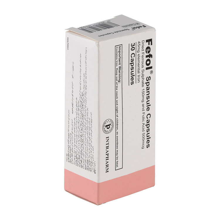 قرص ففول اینترافارم برای پیشگیری و یا درمان کم خونی فقرآهن و یا کمبود فولیک اسید مورد استفاده قرار میگیرد. قرص اهن ففول یا فیفول با جعبه و بسته بندی سفید و نوار صورتی رنگ تحت لیسانس شرکت اینترافارم و در ایران تولید شده است که به همین جهت به آن fefol انگلیسی نیز میگویند. پوسته کپسولها از دو قسمت شفاف و سبز تشکیل شده است که حاوی گرانولهایی به رنگ قرمز، زرد کم رنگ و سفید است. کپسول ففول اینترافارم به صورت اسپانسیول فرموله شده است. اسپانسول به مفهوم آزاد سازی تدریجی یا SR Sustained Released بوده که به تدریج و در طی چند ساعت در دستگاه گوارش آزاد میشود، به گونهای که بیشترین آهن موجود در آن در بخش فوقانی روده کوچک (جایی که بیشترین جذب در آنجا صورت میپذیرد) به تدریج آزاد میشود. قرص ففول فرآورده حاوی آهن و فولیک اسید است که میتواند برای پیشگیری و جبران کمبود آهن و فولیک اسید و کم خونی فقر آهن مورد استفاده قرار گیرد. در کنار این محصول جهت جذب بیشتر آهن میتوانید اقدام به خرید قرص ویتامین سی و استفاده از آن نمایید.