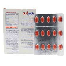 قرص یونی فرو ابیان دارو دارای فرمولاسیون منحصر به فرد و دارای ترکیبی از آهن، ویتامین ث، ب 12 و ب 6 است. یونی فرو نسل جدیدی از مکملهای حاوی آهن هم و غیر هم دارد. حضور آهن هم و غیر هم در کنار یکدیگر اثرات مناسبی داشته و حداقل عوارض گوارشی را ایجاد میکند. مکانیسم جذب این دو آهن با هم متفاوت است؛ در نتیجه بیشترین میزان جذب را در پی دارد. این مکمل جهت کمک به بهبود و جلوگیری از کم خونی ناشی از فقر آهن به کار میرود. حضور فاکتورهای مهم ویتامین C، فولیک اسید و ویتامین B12، سبب افزایش جذب آهن میشود. شایع ترین علائم ناشی از کم خونی فقر آهن شامل احساس سستی، خستگی، سرگیجه، ابتلای مکرر به بیماریهای ویروسی مانند آنفلونزا، ناخنهای قاشقی شکل، خواب رفتن و گز گزدست و پاها و… است.