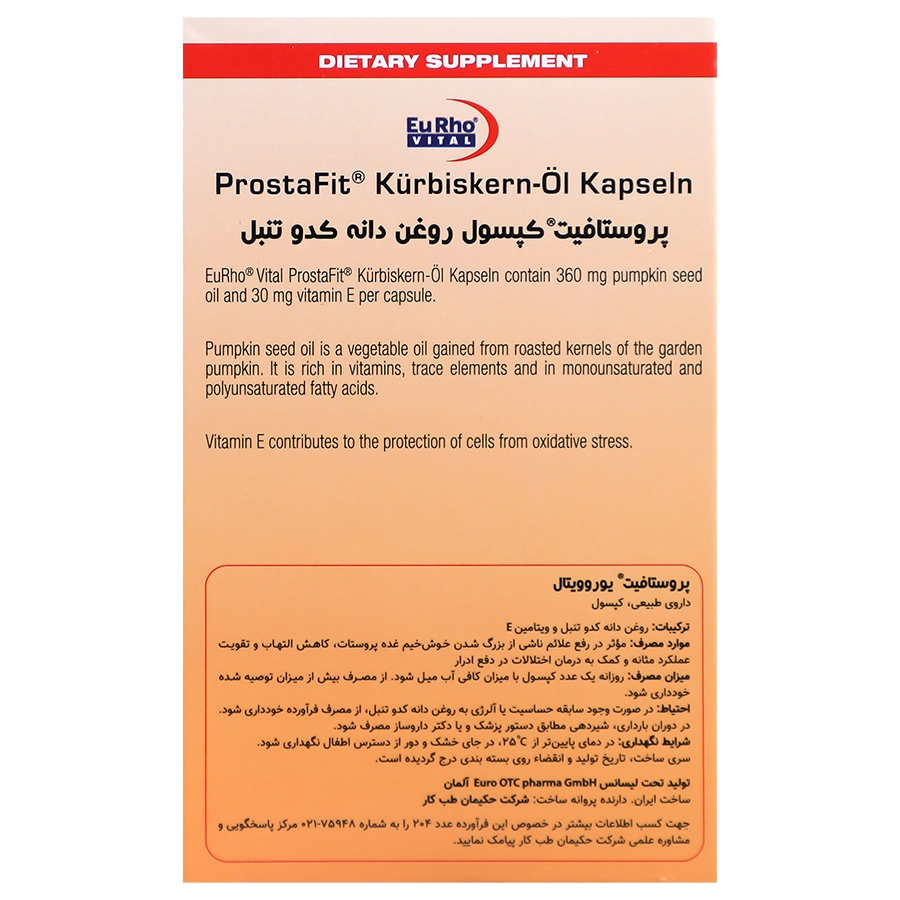 کپسول پروستافیت یوروویتال حاوی ترکیبات موثری چون روغن دانه کدو و ویتامین E است. روغن ارزشمند دانه کدو تنبل سرشار از ویتامینها، عناصر کمیاب و اسیدهای چرب اشباع شده و غیر اشباع است و برای حفظ سلامت پروستات فواید بیشماری دارد. ازآن طرف ویتامین E موجود در قرص پروستا فیت یوروویتال در محافظت از سلولها در برابر استرس اکسیداتیو موثر است.