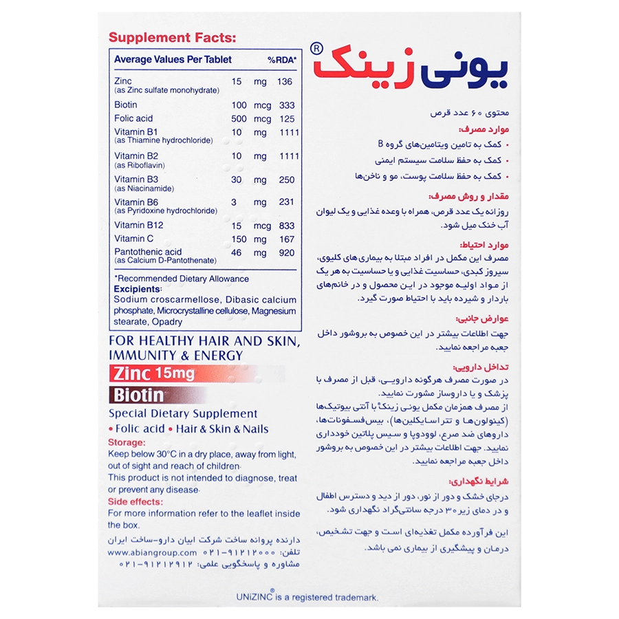 قرص یونی زینک یک مکمل تخصصی برای کمک به حفظ سلامت و شادابی پوست، مو و ناخنها است. این محصول با بهرهگیری از دوز موثری از زینک، بیوتین و ویتامینهای گروه B، نهتنها نیازهای زیبایی شما را تامین میکند، بلکه در تقویت سیستم ایمنینیز نقشی کلیدی دارد. یونی زینک در بستهبندیهای ۶۰ عددی توسط شرکت ابیان دارو تولید و عرضه میشود.