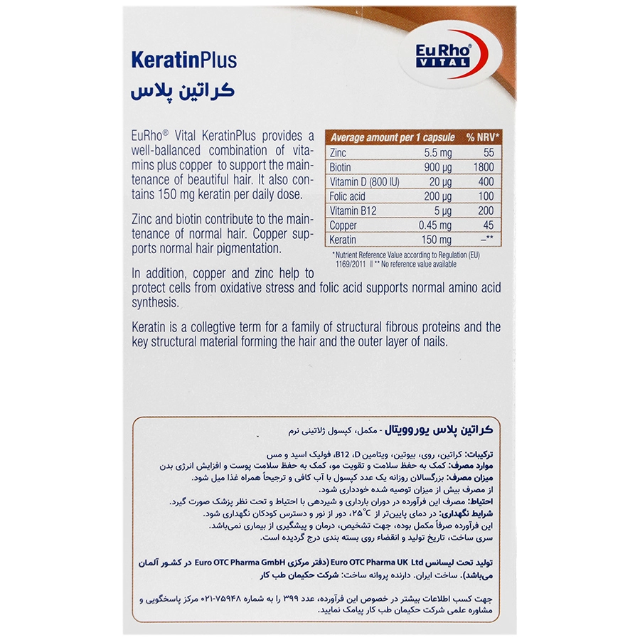 کپسول ژلاتینی نرم کراتین پلاس یوروویتال ترکیبی متعادل از ویتامینها به علاوه مس و کراتین است که در حفظ سلامت و زیبایی مو تاثیر بسیاری دارند. روی نیز در این مکمل پوست و مو از برند یوروویتال به کار رفته است که در کنار بیوتین میتواند از موها محافظت نماید. مس به کار رفته در کراتین پلاس یورو ویتال ترکیبی است که باعث رنگدانه سازی طبیعی مو میشود.